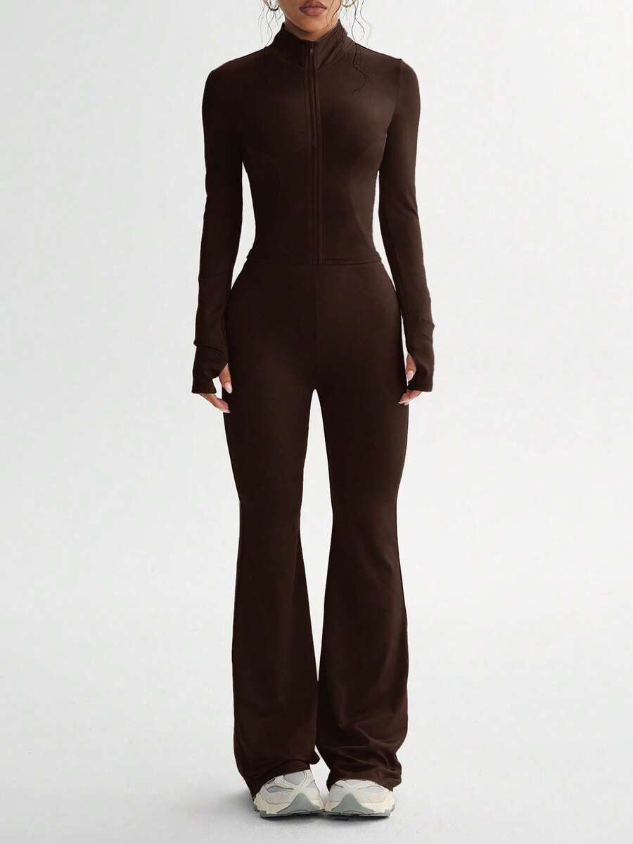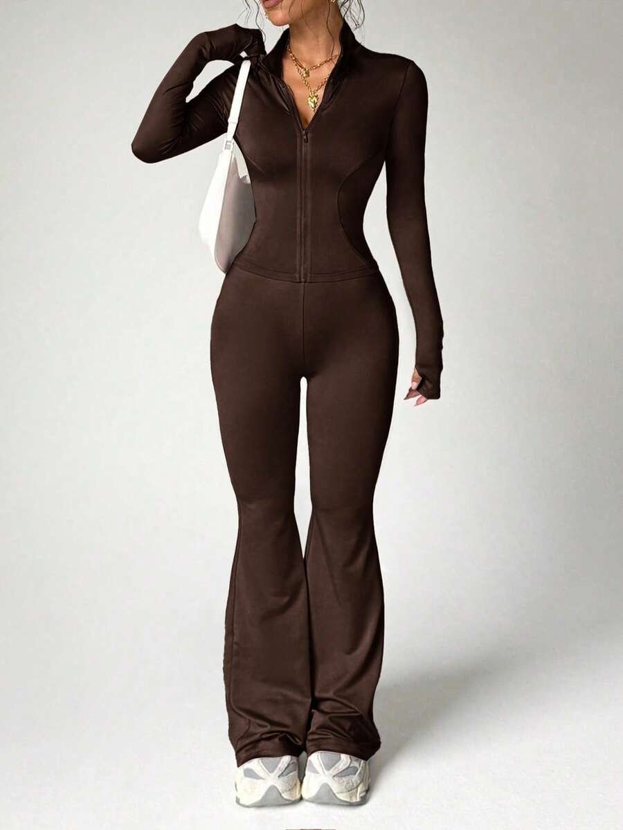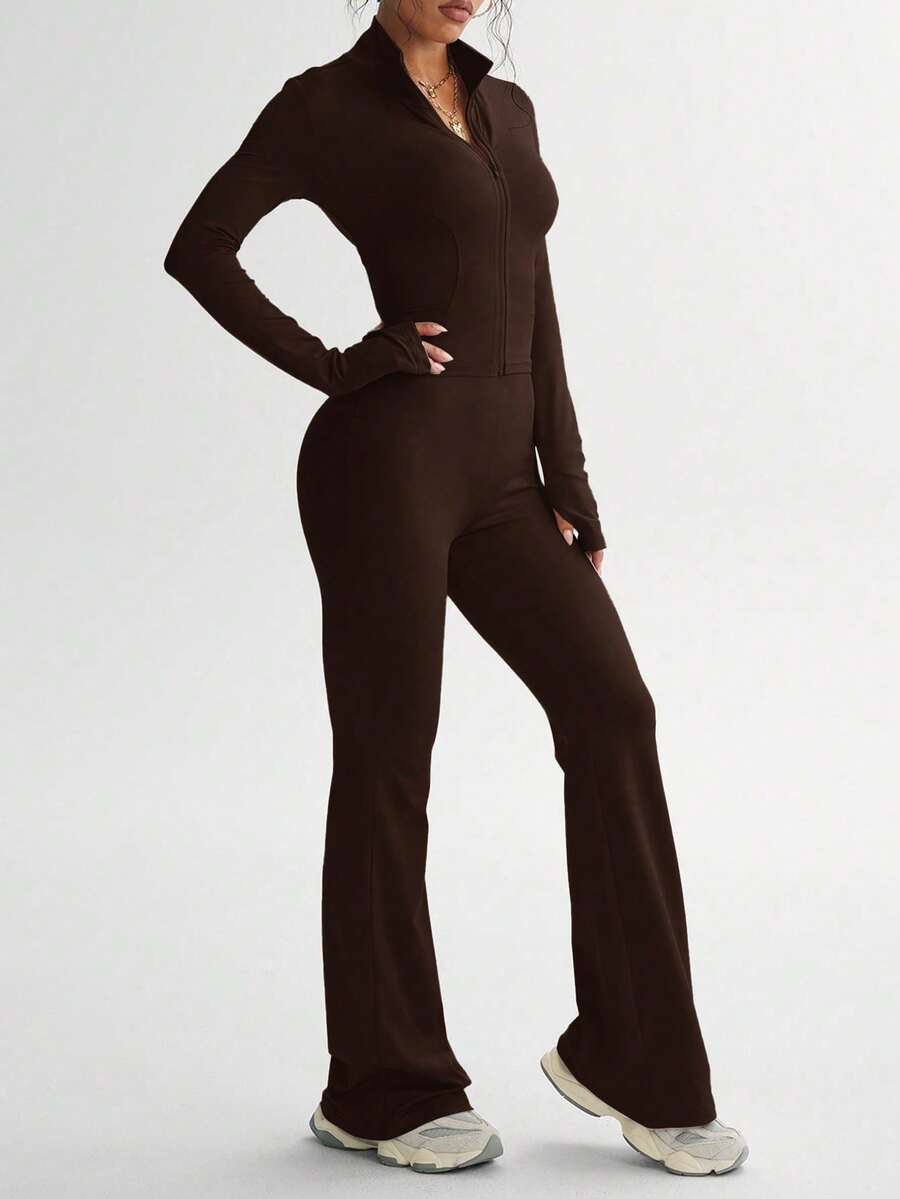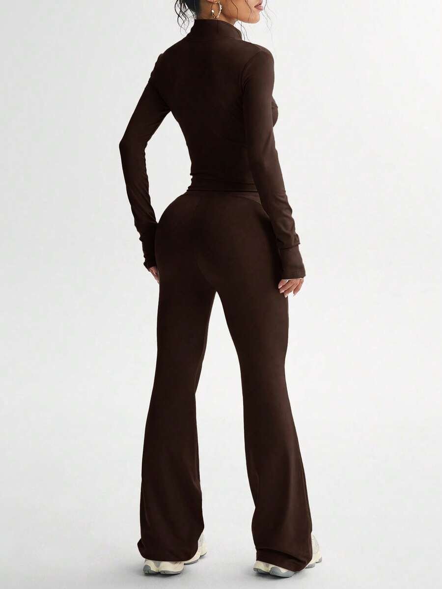 طقم رياضي نسائي بأكمام طويلة وبنطال ضيق باللون البني