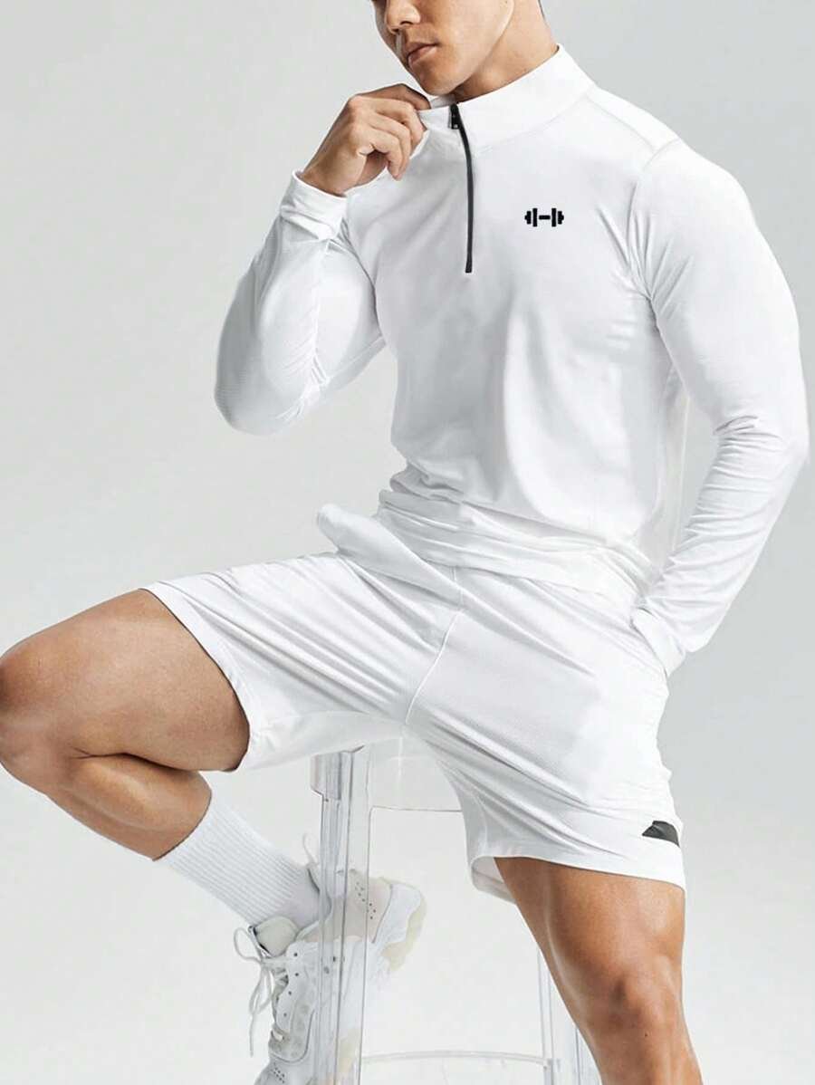قميص رياضي بياقة عالية وأكمام طويلة بطبعة بار الأثقال